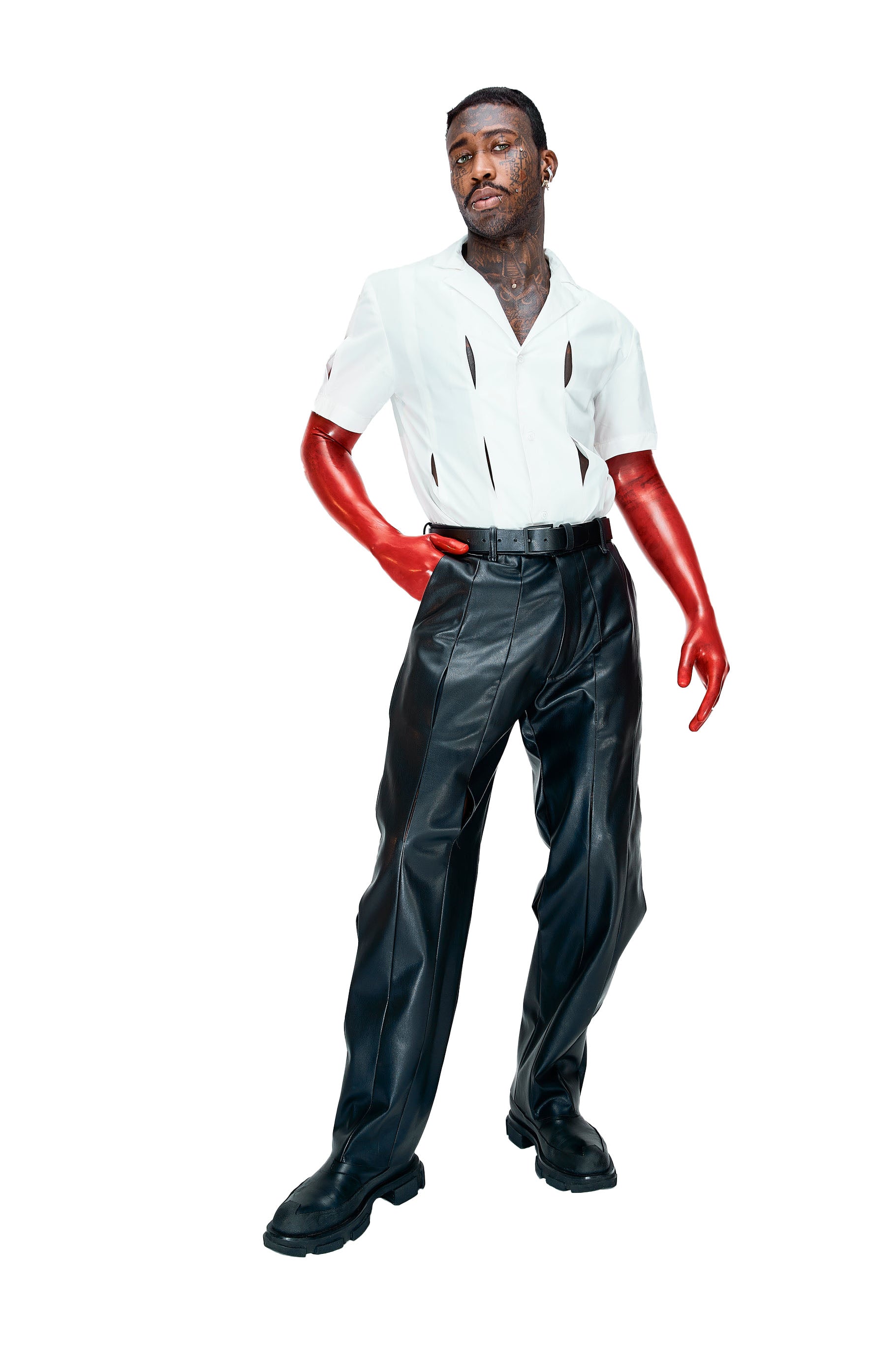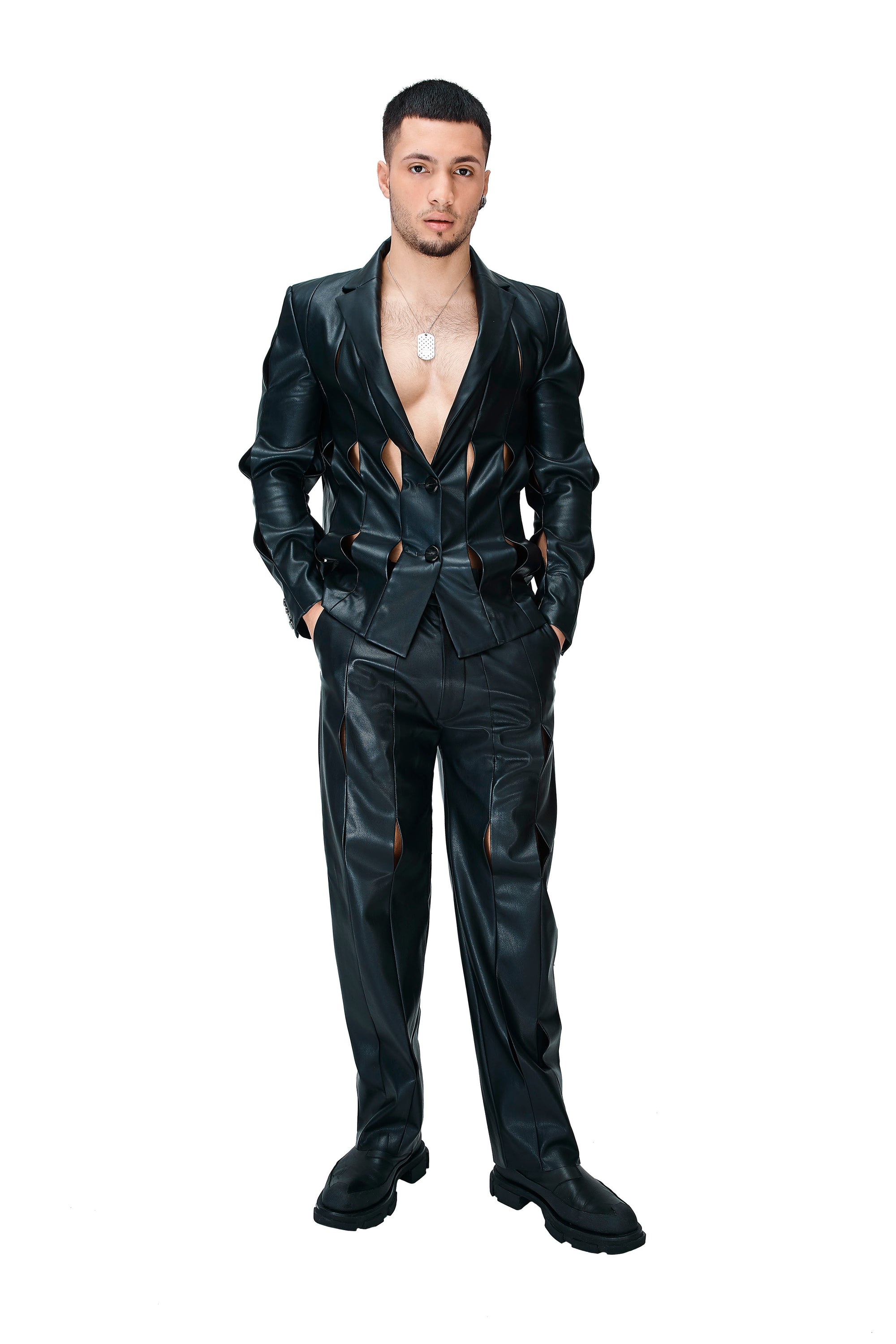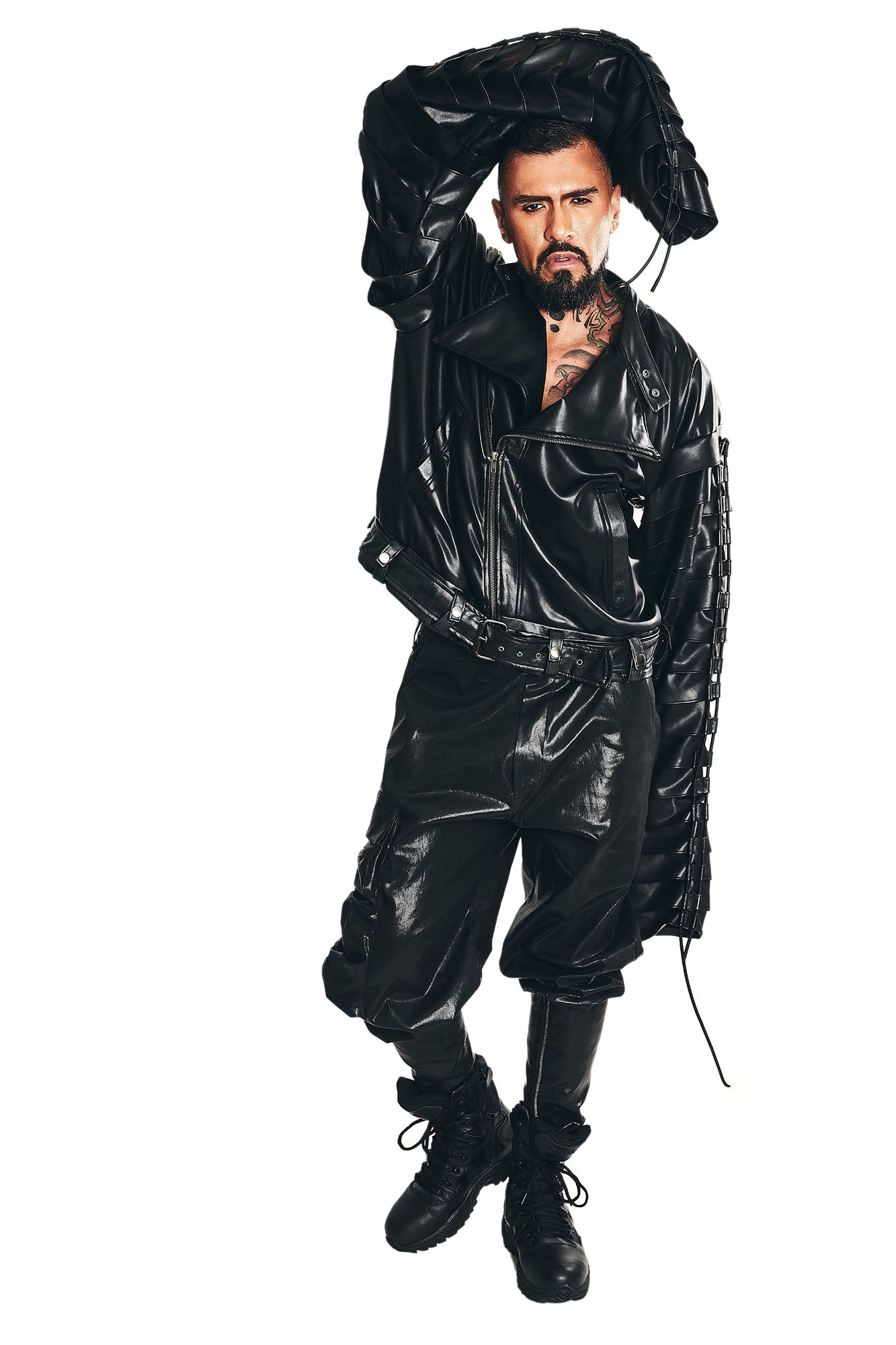 Inspiration for the collection came from the sex-positive side of the LGBTQ community, with a nod to fetish. Until now, Jocks (which are a staple in the gay community) have largely been used for undergarments or as a party look. Geoffrey has combined the jock with outerwear, creating the "Jock-Jacket" to give it a sexy twist. Leather is embedded with symbols to elevate and update the classic fetish material, which is demonstrated on a bulldog-style harness. Leather chaps with revealing slashes give this fetish leather classic a grunge feel. Bodies are partially shared or covered and, most importantly, celebrated with pride.