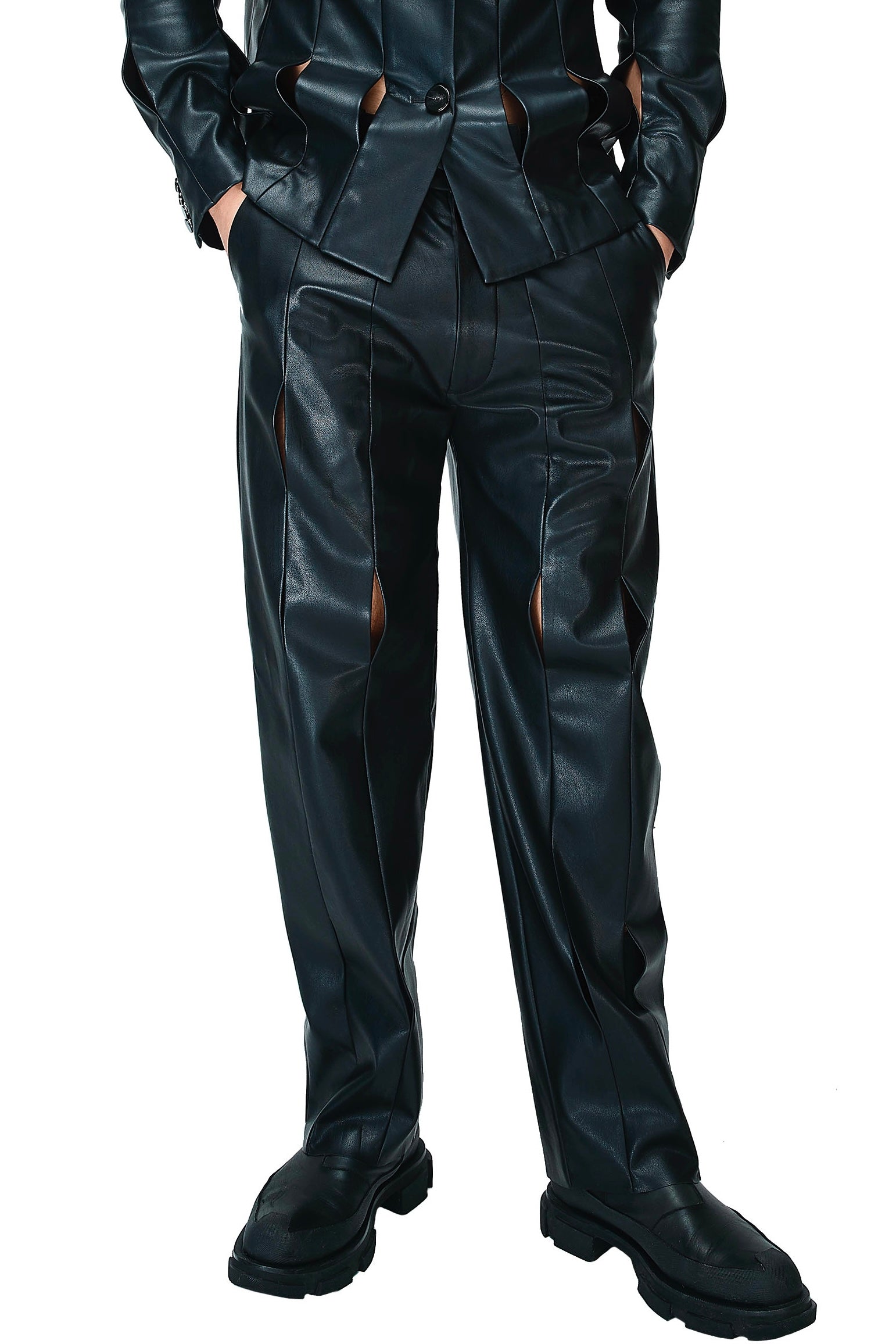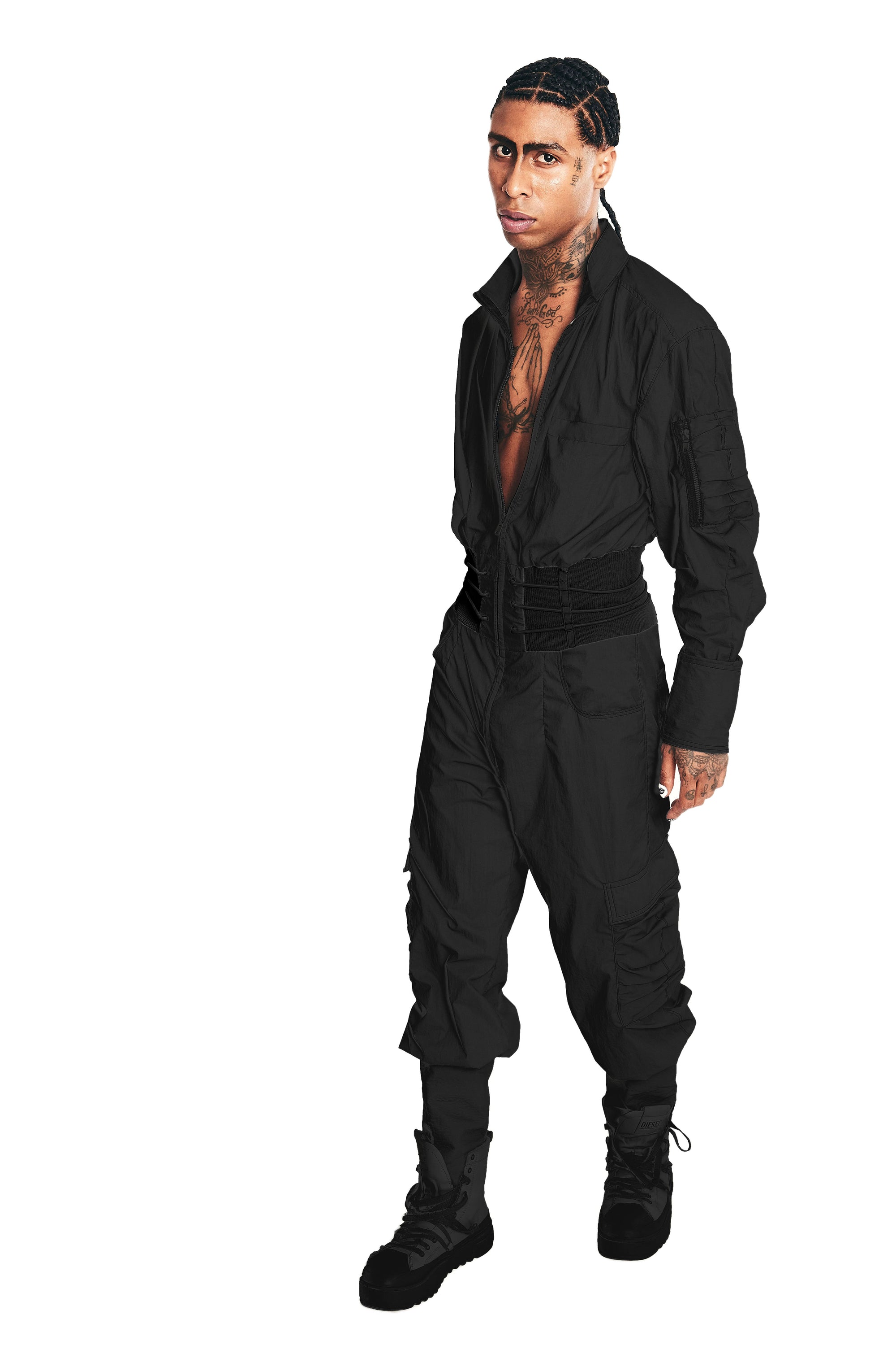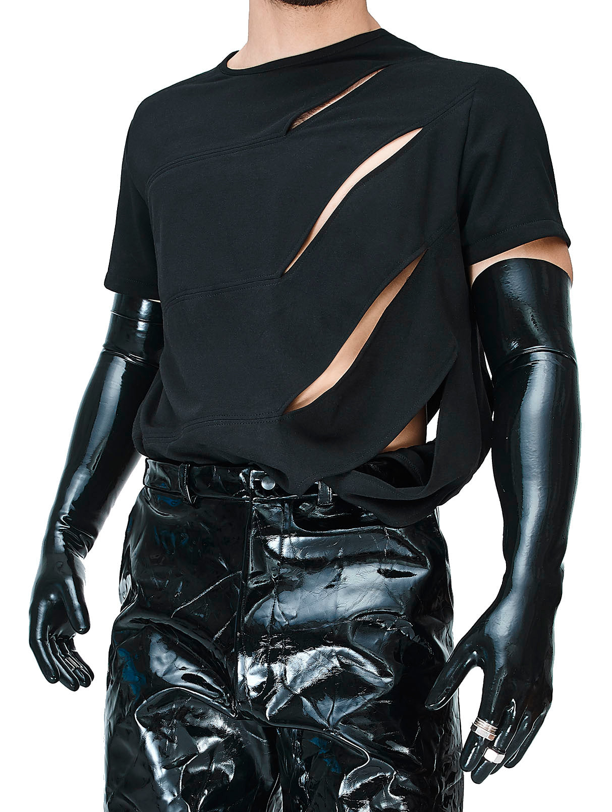 Inspiration for the collection came from the sex-positive side of the LGBTQ community, with a nod to fetish. Until now, Jocks (which are a staple in the gay community) have largely been used for undergarments or as a party look. Geoffrey has combined the jock with outerwear, creating the "Jock-Jacket" to give it a sexy twist. Leather is embedded with symbols to elevate and update the classic fetish material, which is demonstrated on a bulldog-style harness. Leather chaps with revealing slashes give this fetish leather classic a grunge feel. Bodies are partially shared or covered and, most importantly, celebrated with pride.